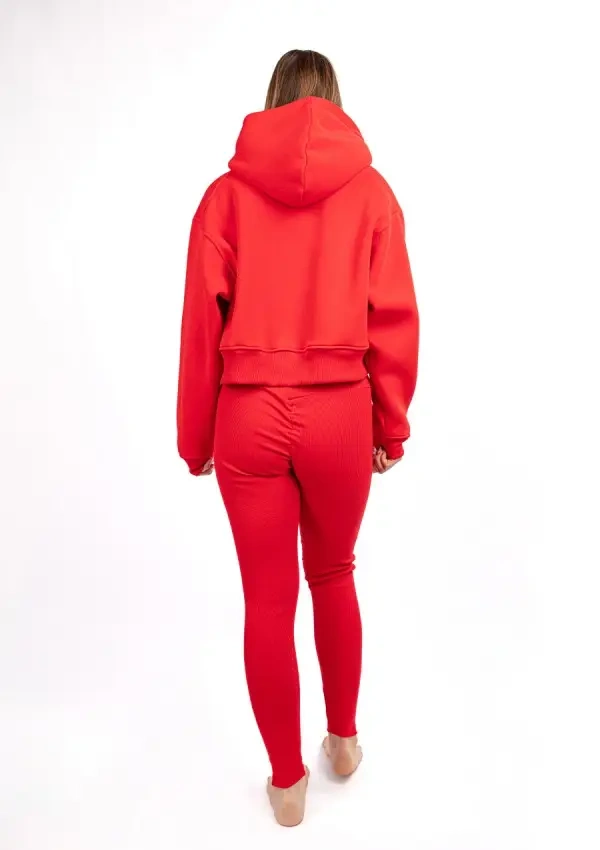 Das Set besteht aus Baumwollleggings mit Rüschen auf der Rückseite und einem kurzen, warmen Sweatshirt, das sich perfekt in das Ganze einfügt. Das Set eignet sich perfekt für alltägliche Aktivitäten, aber auch zum Entspannen zu Hause, wenn Sie sich bequem und stilvoll fühlen möchten.