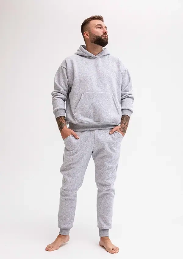 Trainingsanzug-Set aus weicher Baumwolle.  Es besteht aus einem warmen Baumwoll-Sweatshirt mit Kapuze und einer Jogginghose, die volle Bewegungsfreiheit bietet. Die Hose hat unten praktische Bündchen, wodurch sie sich an die Figur anpassen lässt und für zusätzlichen Komfort bei alltäglichen Aktivitäten sorgt.  Dies ist ein Set, das Ihnen sowohl beim Entspannen zu Hause, beim Spaziergang als auch bei Outdoor-Aktivitäten Komfort bietet.