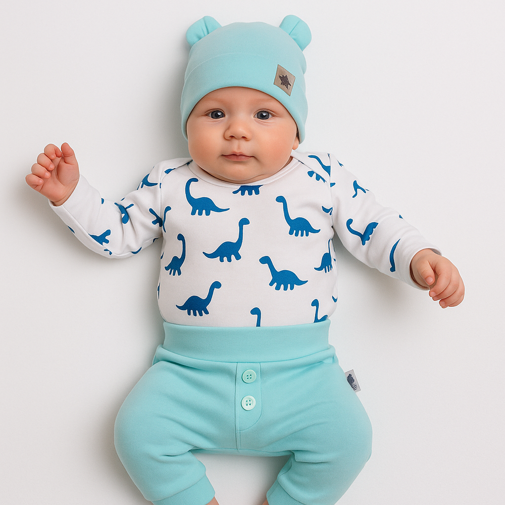 Stelle eine FrageEin 3-teiliges Set für einen Jungen, bestehend aus einer mintfarbenen Hose, einem langärmeligen Body, der im Schritt mit nickelfreien Druckknöpfen aus weißer Baumwolle mit Dinosauriermotiv befestigt wird, und einer Mütze mit Ohren. Das Produkt verfügt über das Zertifikat Öko-Tex Standard 100 Trustworthy Textiles.