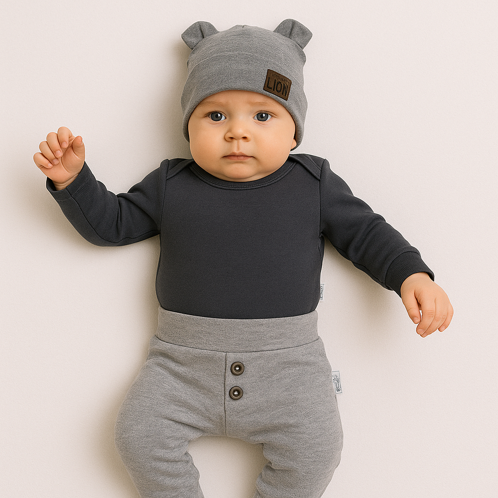 Stelle eine FrageEin 3-teiliges Set für einen Jungen, bestehend aus einer Hose, einem langärmeligen Body mit nickelfreien Druckknöpfen im Schritt und einer Mütze mit Ohren. Das Produkt verfügt über das Zertifikat Öko-Tex Standard 100 Trustworthy Textiles.