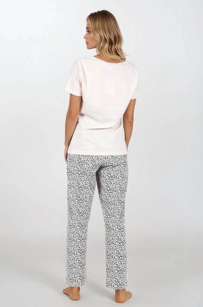 Eleganter und stilvoller Damenpyjama. Kurzarmbluse, lange Hose mit geradem Bein, ohne Taschen. Halbrunder Ausschnitt. Auch perfekt als Homewear geeignet. Hergestellt aus natürlichen Materialien. Entworfen und genäht in Polen