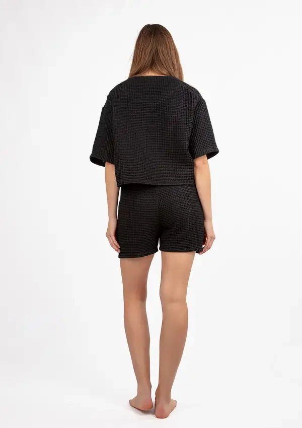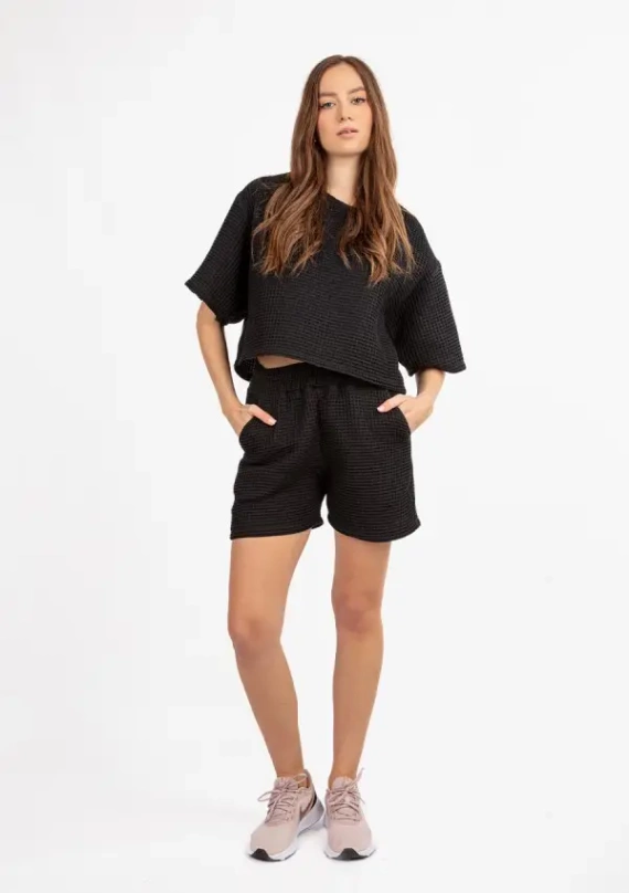 Ein Set bestehend aus Shorts und einem verkürzten T-Shirt, hergestellt in Polen aus hochwertiger 100 % Waffelbaumwolle, die sich nicht nur angenehm anfühlt, sondern auch luftig und langlebig ist. Der cremige Farbton des Stoffes verleiht dem Ganzen eine subtile Note – passend zu vielen Stilen und Accessoires. Waffelbaumwolle ist ein einzigartiges Material, das aufgrund seiner Struktur und funktionellen Eigenschaften an Popularität gewonnen hat. Außerdem ist der Stoff nicht transparent.Dank seiner zarten Webart sorgt dieser Stoff für eine gute Belüftung, was ihn perfekt für den Sommer macht.