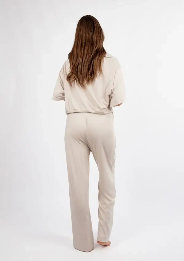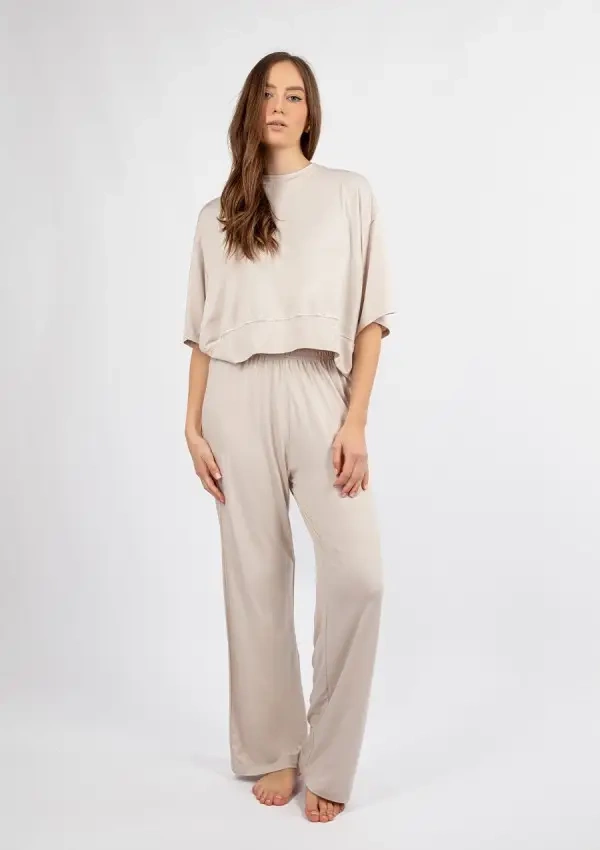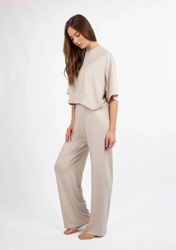 Satz ist eine Kombination aus Komfort, natürlichen Stoffen und dezenter Eleganz. Einer der größten Vorteile ist das Material. Bambusstoff ist ein außergewöhnlich weiches, atmungsaktives und hautfreundliches Material, das für jede Jahreszeit perfekt ist. Durch die fließende Struktur des Stoffes schmiegt sich die Kleidung wunderbar an die Figur an, schränkt die Bewegungsfreiheit nicht ein und sorgt für maximale Bewegungsfreiheit. Bambusgewebe ist außerdem von Natur aus hypoallergen und antibakteriell und daher ideal für Menschen mit empfindlicher Haut.