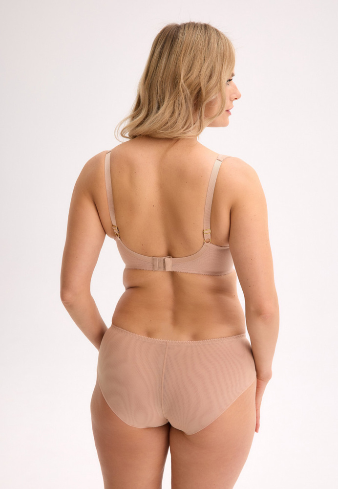 Weicher BH mit Bügeln. Ein Teil des Obercups, des Untercups und der Elemente in der Mitte bestehen aus besticktem Plenum, das mit stabilem Tüll gefüttert ist. Ein Fragment des Obercups aus zartem, mit Band besticktem Stoff.
