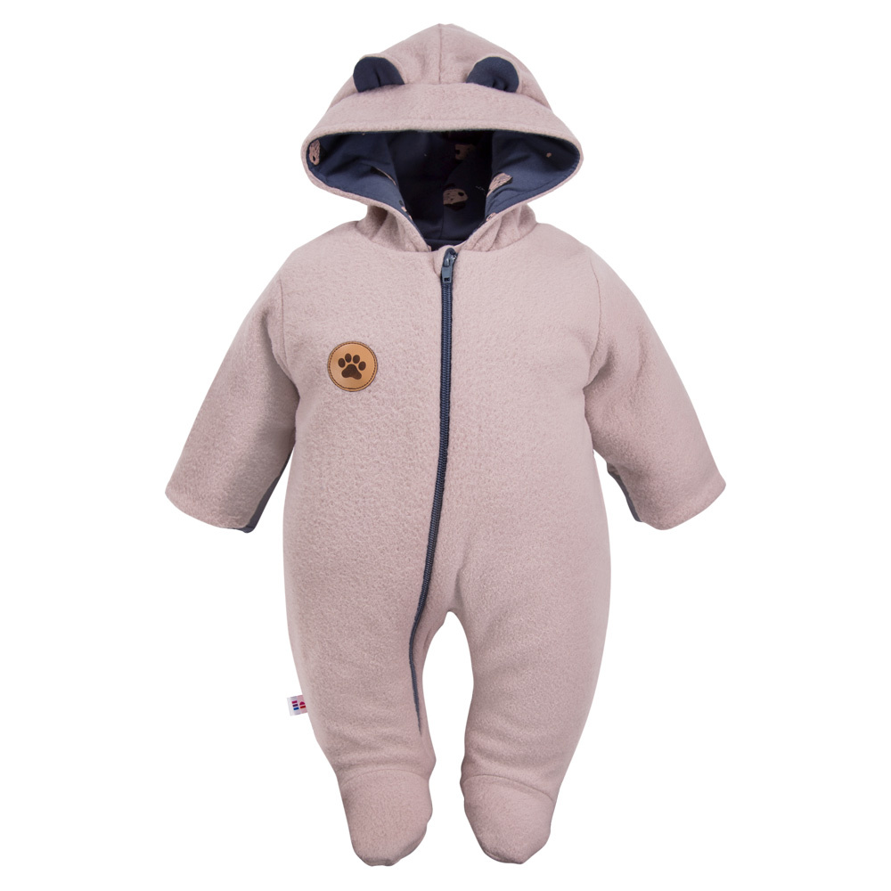 Babyoverall mit Kapuze aus warmem Fleece. Das Futter des Stramplers besteht aus 100 % Baumwolle. Ein Strampler mit Kapuze ist perfekt, um in den kalten Monaten das Krankenhaus zu verlassen. Es ist ein obligatorischer Bestandteil der Babyausstattung für Kinder, die im Winter und Herbst geboren werden.