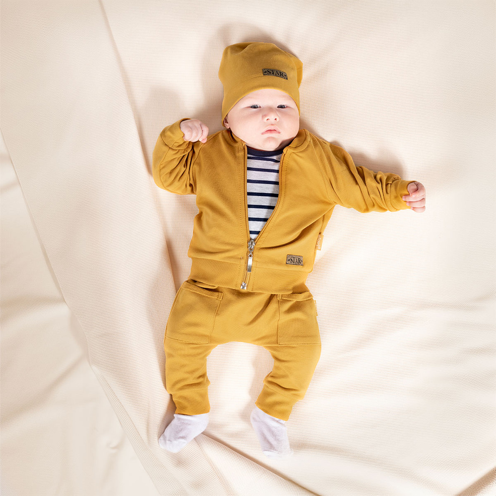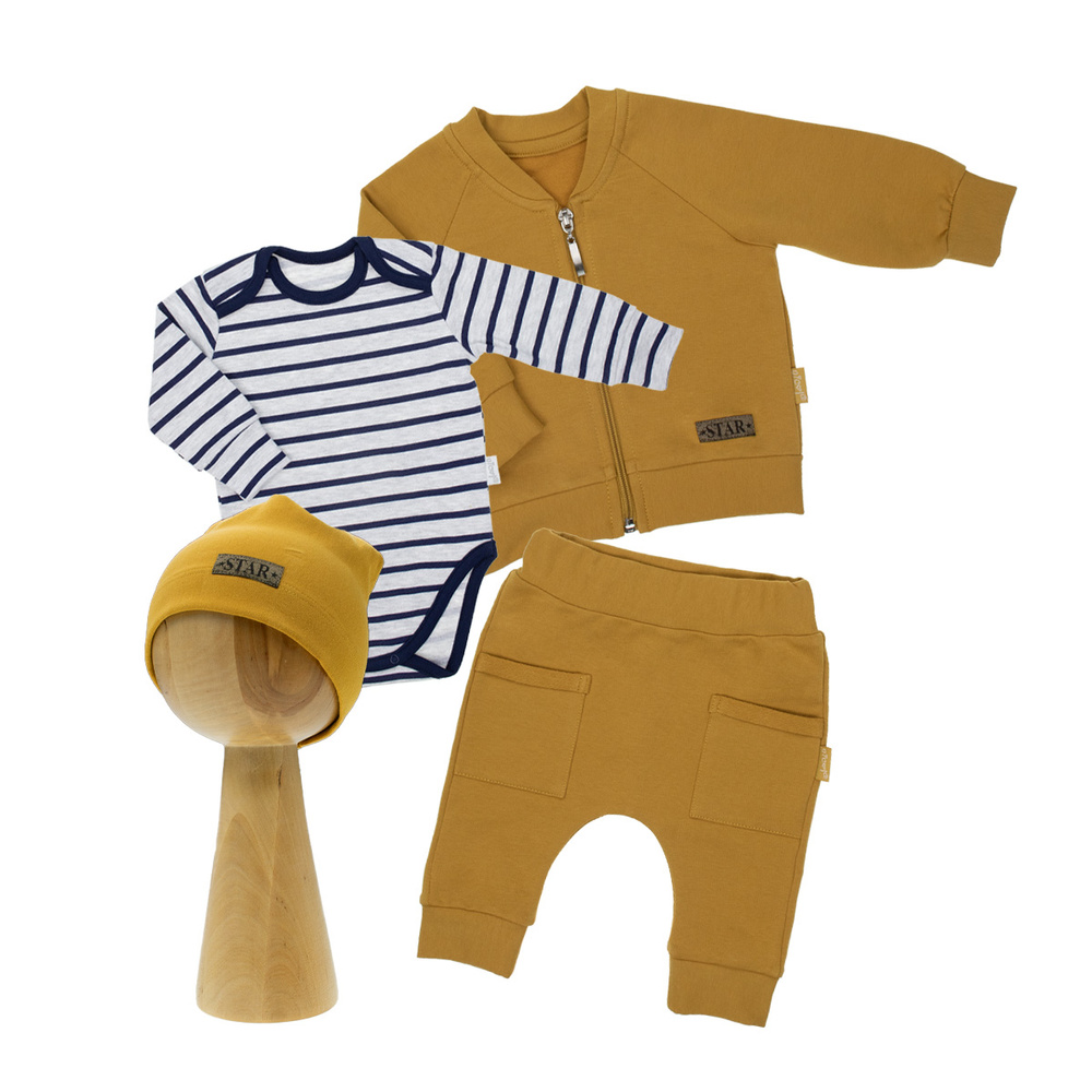 Stelle eine FrageEin Set bestehend aus 4 Elementen: einem langärmeligen Body, einer Mütze, einer Hose und einer Bomberjacke mit Reißverschluss. Das Set besteht aus Sweatshirt-Baumwolle mit Elasthan, Öko-Tex Standard 100 zertifiziert. Zuverlässige Textilien.
