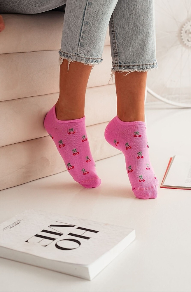 Damensocken aus Baumwolle mit Kirschmuster verziert. Sie haben flache Nähte und ein druckfreies Bündchen.