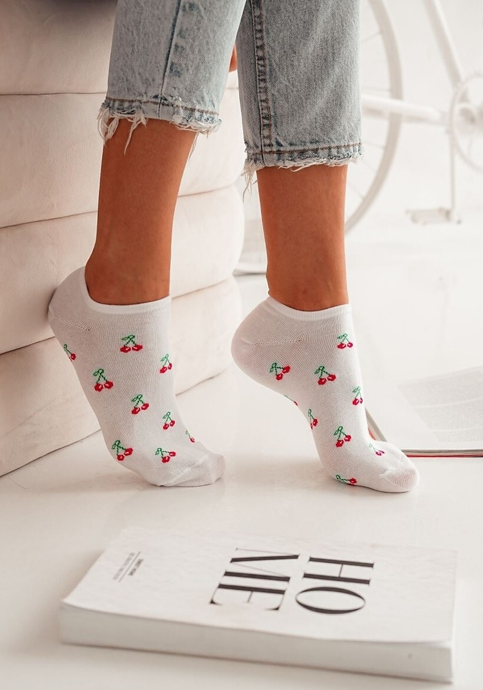 Damensocken aus Baumwolle mit Kirschmuster verziert. Sie haben flache Nähte und ein druckfreies Bündchen.