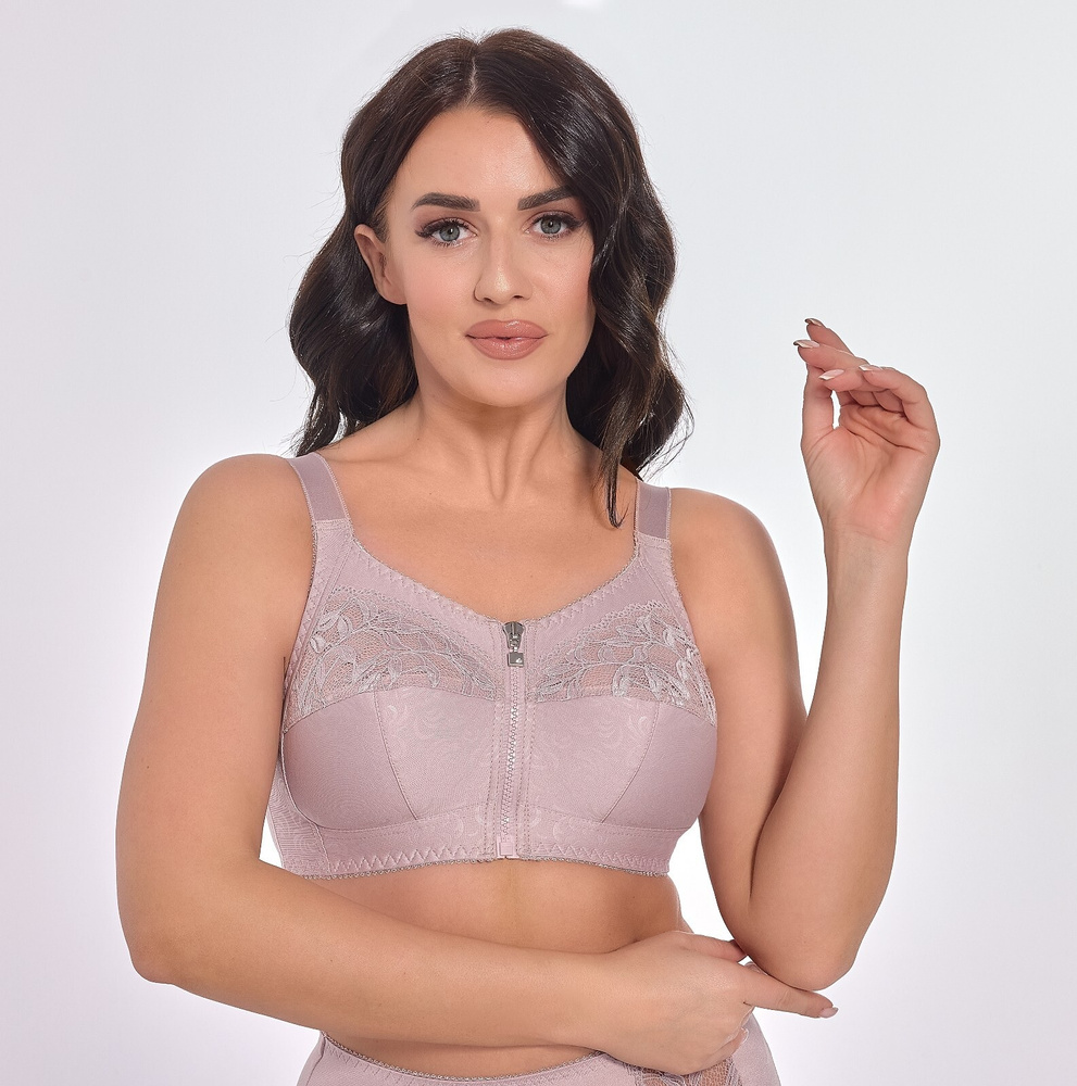BH ohne Bügel. Es wurde für Frauen mit größeren, vollen Brüsten entwickelt.  Innovativer Frontreißverschluss, der das An- und Ausziehen deutlich erleichtert. Der Reißverschluss an der Unterseite ist mit einem Futter versehen, das den Körper vor Abschürfungen schützt und für ein angenehmes Tragegefühl sorgt. Die hohe Mitte stützt und rundet die Brust gut ab.