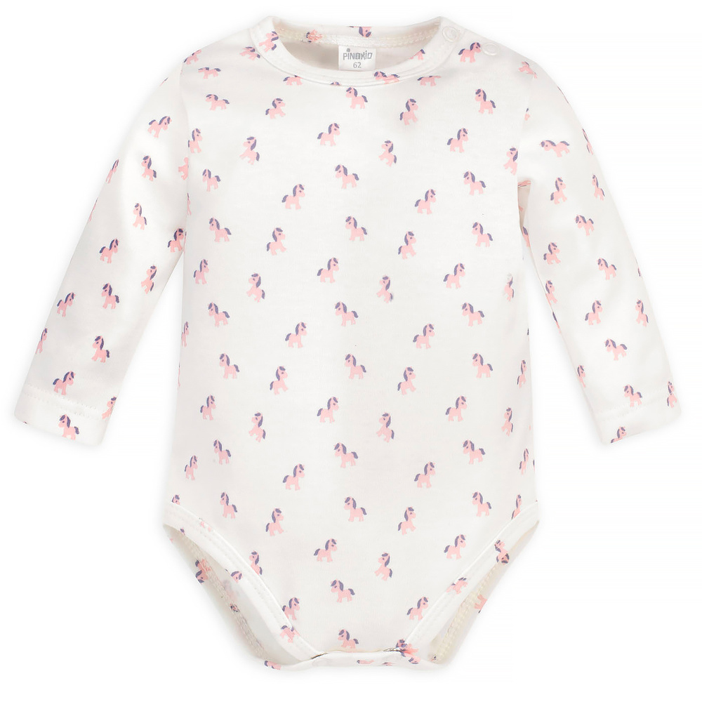 Der langärmlige Baby-Body ist aus 100 % zarter Ecru-Baumwolle gefertigt und mit einem mädchenhaften Pferde-Print verziert. Dank des Verschlusses im Schritt und am Hals mit sicheren, nickelfreien Druckknöpfen lässt sich das Kleidungsstück sehr einfach anziehen. Der Body ergibt ein wunderschönes Set mit Schlafanzügen und einer Mütze aus der gleichen Kollektion. Dies ist ein wesentlicher Bestandteil der Erstausstattung für ein Neugeborenes. Es wird in Polen hergestellt.