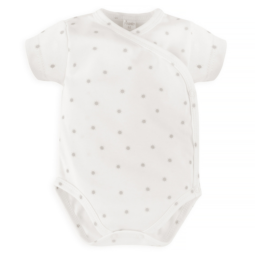 Baby-Body, gebunden, mit kurzen Ärmeln, aus 100 % zarter Baumwolle. Der Umschlagausschnitt mit sicheren, nickelfreien Druckknöpfen macht das Anziehen und Wickeln Ihres Babys ganz einfach. Das Outfit wird mit Schlafanzügen und einer Mütze aus der gleichen Kollektion großartig aussehen. Ein Babybody ist ein wesentlicher Bestandteil der Babyausstattung eines Neugeborenen. Es wird in Polen hergestellt.