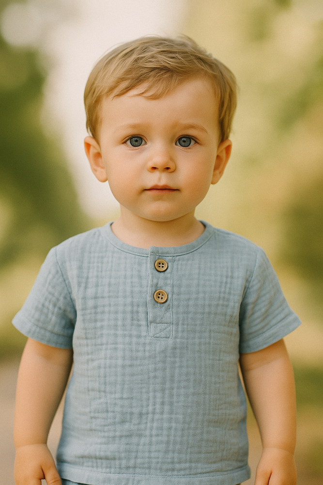 Jungenbluse aus Musselin. Die Bluse ist eine praktische und bequeme Option, die sich perfekt zum Spielen oder Spazierengehen eignet.