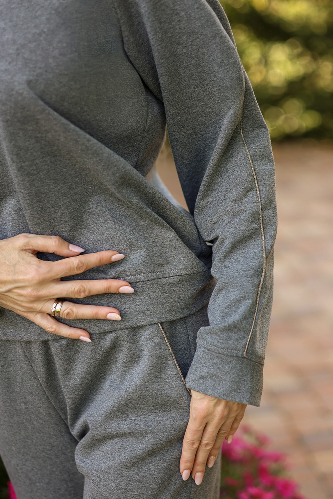 Das Set besteht aus einem klassisch geschnittenen Sweatshirt und einer Hose mit bequemem Gürtel und Taschen. Eindrucksvolle Verzierungen in Form von zarten, glänzenden Nähten an den Ärmeln und Taschen verleihen dem Trainingsanzug einen einzigartigen Charakter.