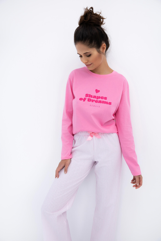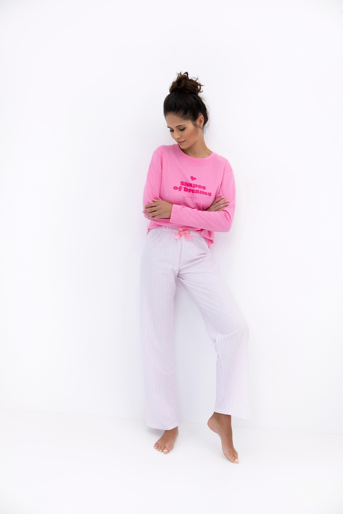 • Malaya Sensis Baumwollpyjama – kurzärmeliges T-Shirt mit dekorativer Aufschrift, lange Hose mit Gummiband und Schleife. Komfort und Stil jeden Abend.