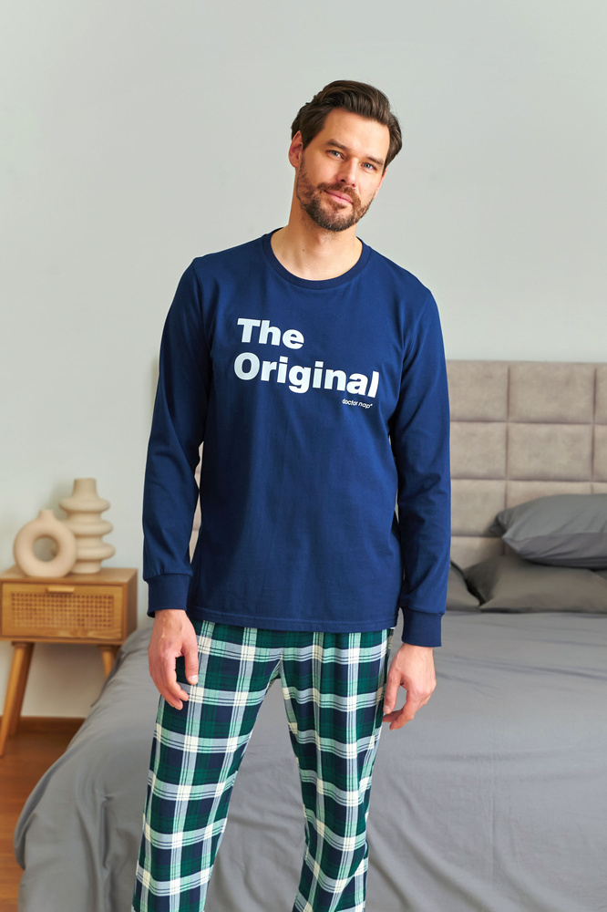 Der Herrenpyjama Doctor Nap 7341 ist ein stilvolles Set, perfekt für jede Jahreszeit. Es besteht aus einer langärmeligen Baumwollbluse mit „The Original“-Aufdruck und einer klassischen karierten Hose mit geripptem Saum. Dieses Modell ist Teil der Familienkollektion – Sie können passende Sets für Ihren Partner und Ihr Kind auswählen und so ein stimmiges, modisches Ganzes für gemeinsame Abende oder Fotos schaffen. Die polnische Produktion gewährleistet Qualität und Komfort.
