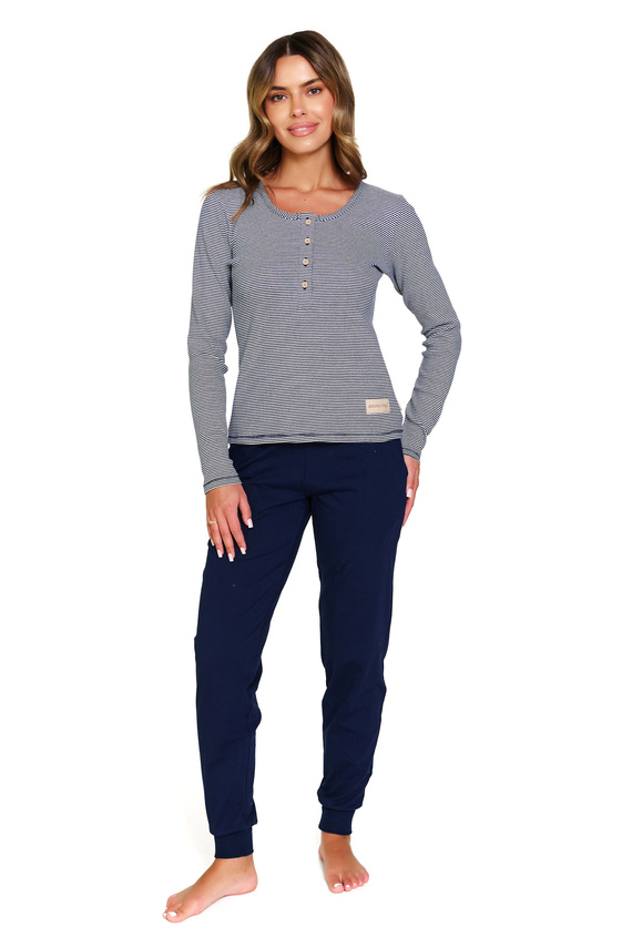 Der Damenpyjama Doctor Nap 7352 ist ein bequemes Set für jede Jahreszeit und kombiniert klassischen und modernen Stil. Eine Bluse mit langen Ärmeln, einer dezenten Knopfleiste und dekorativen Knöpfen passt perfekt zu einer geraden Hose mit Manschetten. Aus weicher, hautfreundlicher Baumwolle gefertigt, sorgt es für angenehmen Schlaf und Tragekomfort im Alltag. Die polnische Produktion ist ein Garant für Sorgfalt und hohe Qualität.