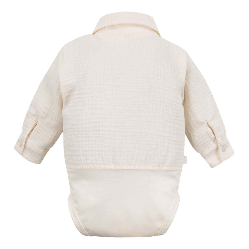 Der Body hat einen klassischen Hemdenschnitt mit Kragen, der ihm Eleganz verleiht und gleichzeitig funktionell bleibt – dank des Druckknopfverschlusses im Schritt und an der Schulter geht das Anziehen Ihres Kindes schnell und bequem. Der Musselinstoff ist leicht, luftig und freundlich zur zarten Haut des Babys.