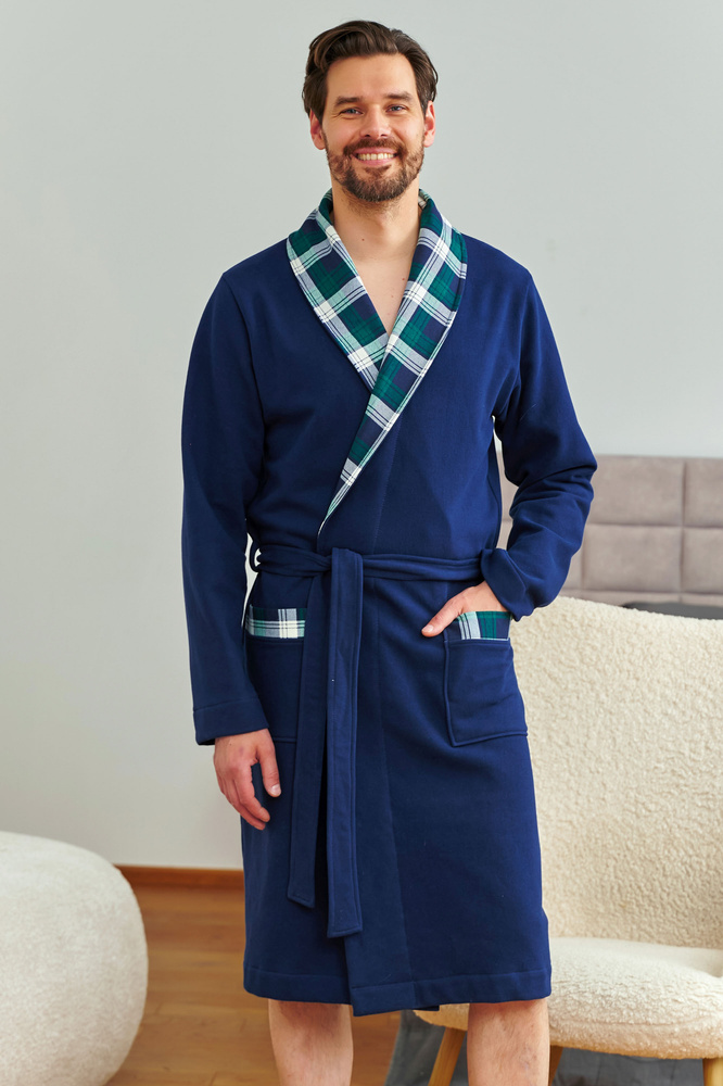 Das Modell 7366 ist ein Angebot für einen Mann, der sowohl Komfort als auch guten Stil schätzt. Der aus hochwertiger Baumwolle gefertigte Bademantel umhüllt den Körper mit weichem, natürlichem Material. Der klassische Schnitt in tiefem Marineblau wird durch Details aus Schottenstoff ergänzt – am Kragen und an den Taschen. Das Bindeband in der Taille sorgt für eine perfekte Passform und die praktischen Taschen unterstreichen die Funktionalität des Modells. Perfekt für kalte Morgen und Abende mit einem Buch oder einer Fernsehserie. Das ist Wohnluxus vom Feinsten.