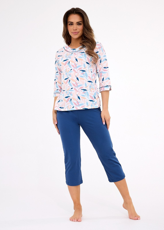 Bluse mit 3/4 Ärmel ist eine praktische Lösung für jede Jahreszeit – nicht zu warm, nicht zu kalt. Die 3/4-Hose sitzt perfekt und der elastische Bund sorgt für Bewegungsfreiheit und Tragekomfort. Das zarte Muster und die sorgfältige Verarbeitung verleihen dem Pyjama Charme und Leichtigkeit.