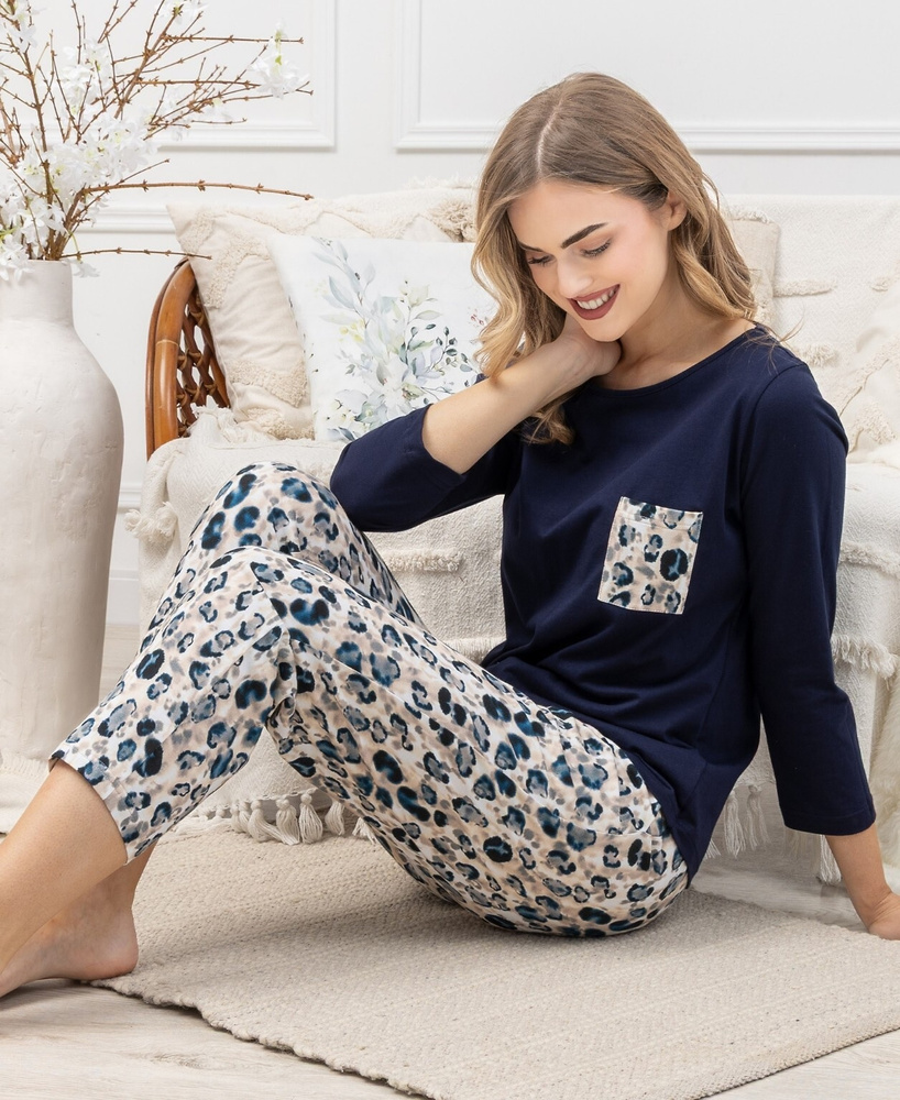 Bluse mit Langarm und klassische, weite Hosen bilden ein stimmiges Set, das die Bewegungsfreiheit nicht einschränkt und völlige Entspannung ermöglicht. Tief marineblaue Farbe verleiht dem Pyjama einen eleganten und zeitlosen Charakter.