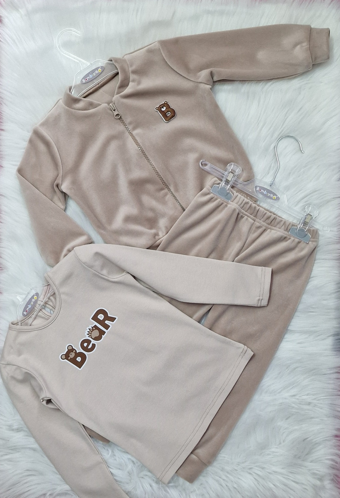 Der Kinder-Trainingsanzug Bear von Bambarillo ist eine ideale Option für Eltern, die ein bequemes und stilvolles Set für ihr Kleinkind suchen. Aus weichem, angenehm anzufassendem Velours aus 95 % Polyester und 5 % Elasthan gefertigt, umhüllt es das Kind wie eine Decke – und spendet ihm Wärme und vollen Tragekomfort.