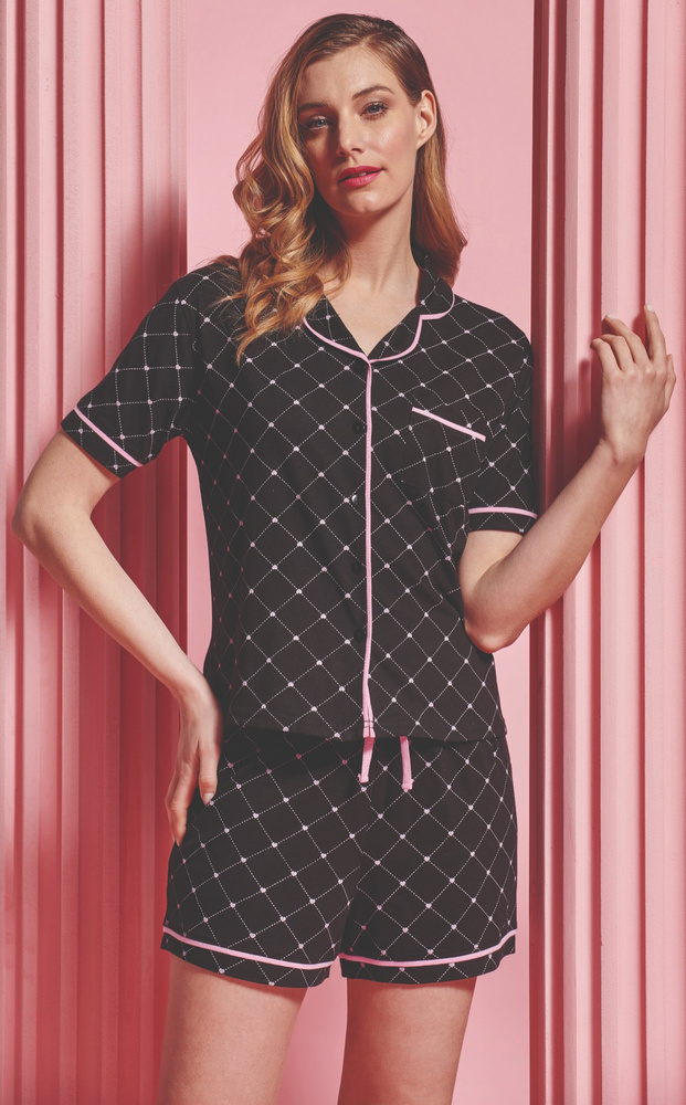 Coraline Sorbetto Damenpyjama, Schwarz – Hemdoberteil, kurze Shorts, 100 % Baumwolle