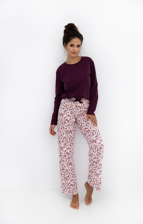 Die Unterseite des Pyjamas besteht aus einer langen Hose mit bezauberndem Blumenmuster, ausgestattet mit einem Gummiband in der Taille und einer dekorativen Satinschleife, die für eine bequeme Passform sorgt und femininen Charme verleiht.