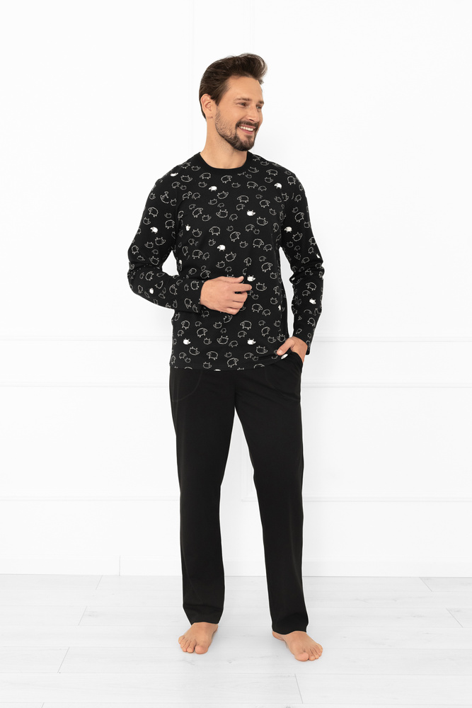 • Herren Schlafanzug Wito gestrickt MEGA SOFT (100% Baumwolle). Langärmelige Bluse mit Rundhalsausschnitt in Schwarz mit weißem Schafmotiv. Unifarbene Hose mit elastischem Bund und Seitentaschen.