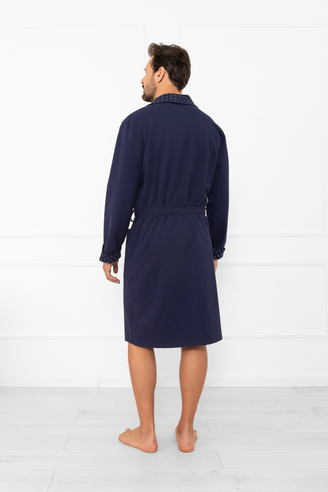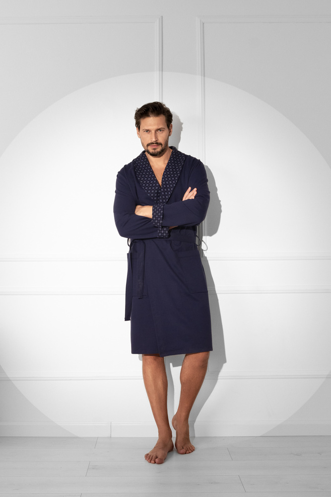 • Modischer Herrenbademantel Gerard aus 100% hochwertiger Baumwolle. Klassischer Schnitt, Schalkragen, Manschetten mit elegantem Druck, praktische Taschen und Taillenband für perfekten Sitz.