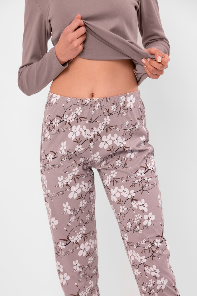 Die Kimuri Schlafanzüge für Frauen sind die perfekte Kombination aus Komfort und Stil. Aus natürlicher Baumwolle hergestellt, ist es weich, atmungsaktiv und hautfreundlich. Das Oberteil des Sets ist eine glatte, langärmelige Bluse in einem warmen Cappuccino-Ton, verziert mit einer dezenten Satinschleife am Rundhalsausschnitt.