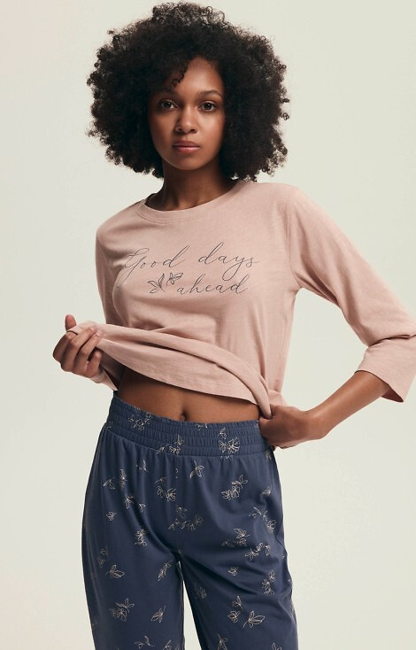 Der Damenpyjama 43699 von Henderson Delanie ist die perfekte Kombination aus Komfort und femininem Stil. Das Set beinhaltet ein T-Shirt mit 3/4-Ärmeln, Rundhalsausschnitt und dekorativem Aufdruck auf der Vorderseite sowie eine Fischerhose mit modischem Pflanzendruck.
