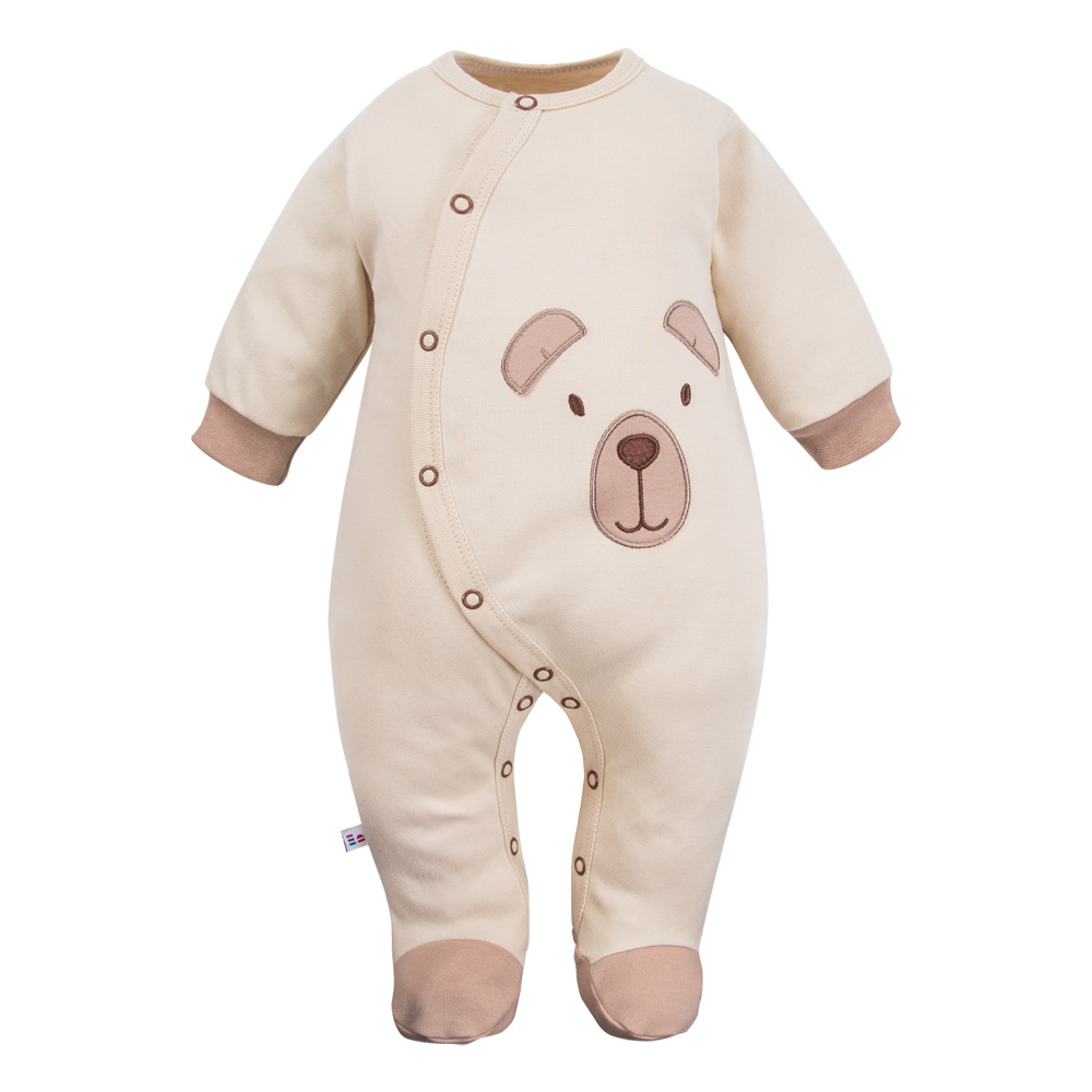 Das ecrufarbene Modell ist mit bezaubernden Teddybär-Stickereien und kontrastierenden Paspeln verziert, die ihm einen dezenten Charakter verleihen. Integrierte Füße halten Ihr Baby warm und der praktische durchgehende Verschluss mit nickelfreien Druckknöpfen ermöglicht ein schnelles und einfaches Umziehen, auch nachts.
