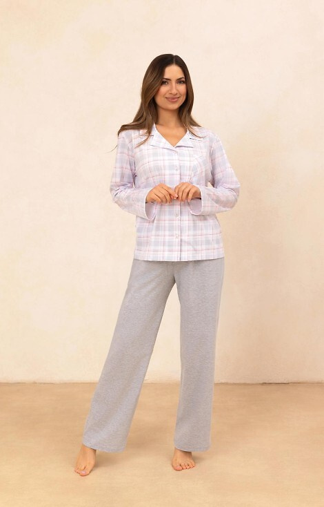 727 Damen-Pyjama Regina grau – 100 % Baumwolle, kariert, Hemd mit Knöpfen