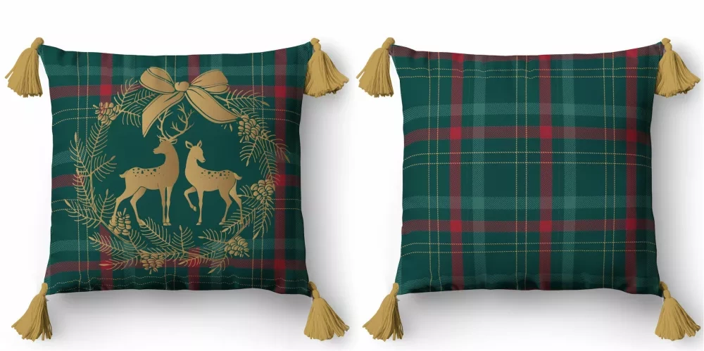 5380 A Dekorativer Weihnachtskissenbezug Weihnachtsdeko Detexpol Rentier im Kranz auf kariertem Hintergrund – Reißverschluss