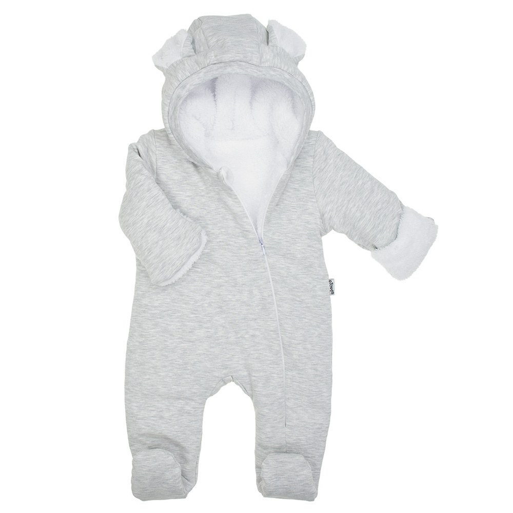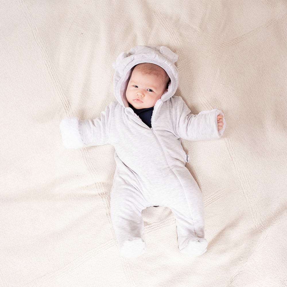 Das hellgraue Modell zeichnet sich durch bezaubernde Ohren an der Kapuze aus, die dem Ganzen einen einzigartigen Charme verleihen. Der Strampler hat bedeckte Füße und hochgekrempelte Ärmel. Der lange Reißverschluss erleichtert das schnelle Wechseln der Kleidung. Dies ist ein praktisches und stilvolles Outfit für die Kleinen.