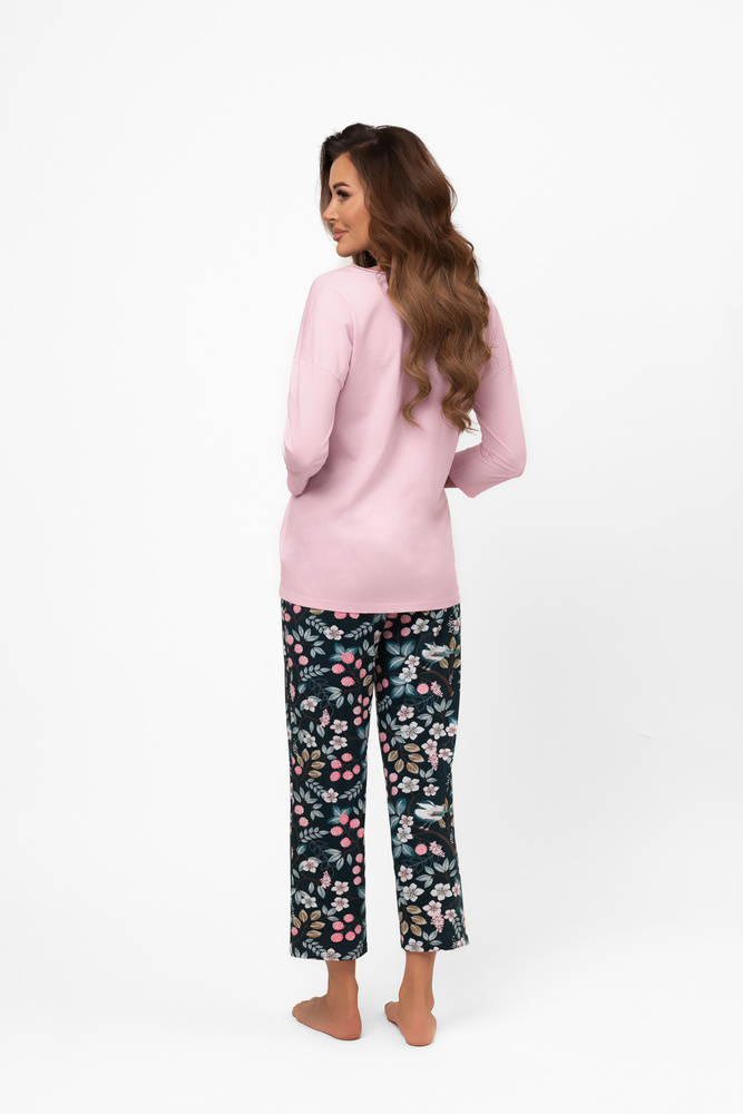 Der Marisal Damenpyjama ist ein bequemes Set zum Schlafen und Entspannen zu Hause. Diese helle Bluse mit V-Ausschnitt und 3/4-Ärmeln hat einen geraden Schnitt für Bewegungsfreiheit und Komfort während der Nacht. Die glatte Textur des Stoffes ergänzt perfekt die kontrastierende Hose. Die dunkle Hose mit Blumenprint hat eine 7/8-Länge, ein gerades Bein und einen elastischen Bund, der nicht drückt und sich der Figur anpasst. Dieser Pyjama aus natürlicher Baumwolle garantiert Atmungsaktivität, Weichheit und Haltbarkeit. Die ideale Wahl für Frauen, die auf der Suche nach einem bequemen, aber dennoch ästhetisch ansprechenden Pyjama sind.