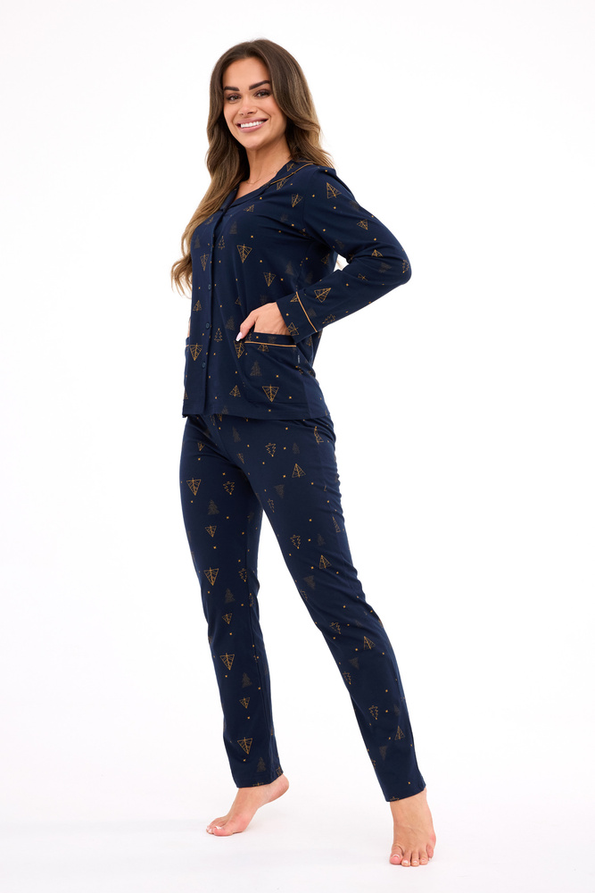 482/447 Gold Cornette Damenpyjama – Weihnachten, Baumwolle, Marineblau, geknöpft