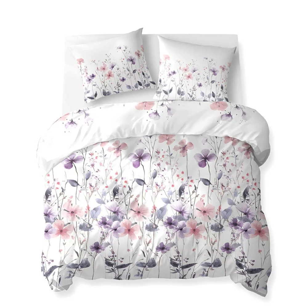 5773 B Cotton Bloom Detexpol weiße Baumwollbettwäsche mit rosa und lila Wildblumen – 100 % Baumwolle, doppelseitig, polnische Produktion