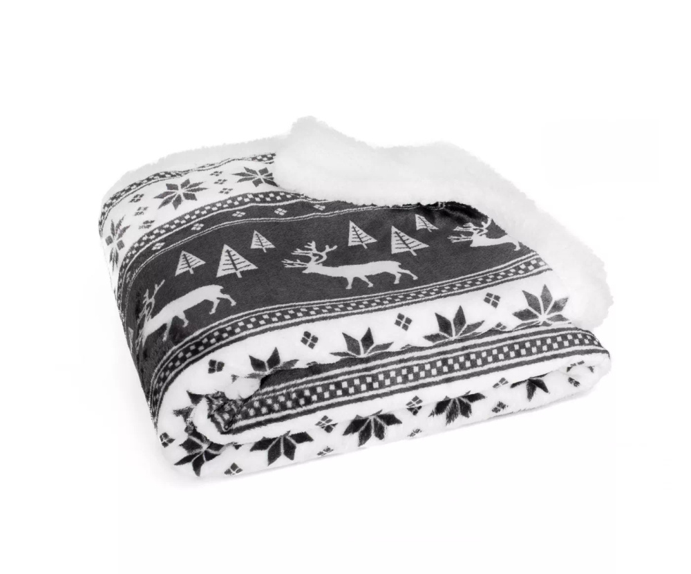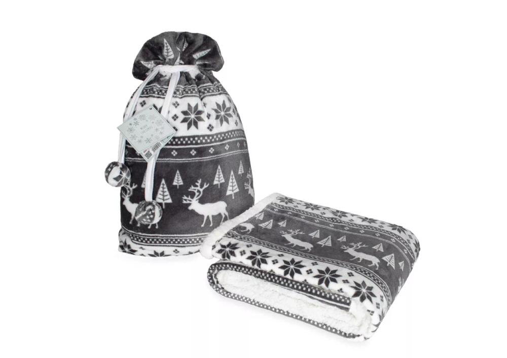 SACO Weihnachtsdecke, grau – weich und warm mit Rentieren und Weihnachtsbäumen im dekorativen Beutel