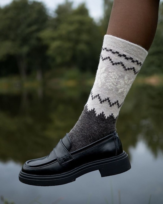 Das Modell zeichnet sich durch ein eindrucksvolles Wintermuster aus, das ihm einen gemütlichen Charakter verleiht. Flache Nähte eliminieren das Risiko von Abschürfungen und ein bequemes Bündchen hält die Socke ohne Druck an Ort und Stelle. Sie eignen sich perfekt für höhere Schuhe – perfekt zum Spazierengehen, Arbeiten oder zum Tragen zu Hause.