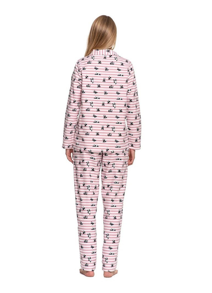 Das Modell zeichnet sich durch einen fröhlichen Streifendruck mit süßen Pandas aus, der dem Ganzen Leichtigkeit und einen positiven Charakter verleiht. Der obere Teil des Pyjamas ist ein klassisches Langarmshirt mit Knopfverschluss und elegantem Kragen. Die lange Hose verfügt über praktische Taschen und einen bequemen elastischen Bund, der mit Stoff besetzt ist, der für eine perfekte Passform sorgt.