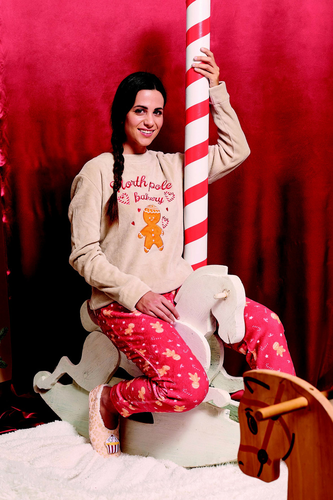• Der Meddy Sorbetto-Pyjama aus weichem Korallenfleece umhüllt Sie im weihnachtlichen Stil. Sweatshirt mit Schaukelpferd und der Aufschrift „Ginger Horse“, Hose mit Lebkuchen- und Zuckerstangenmotiv