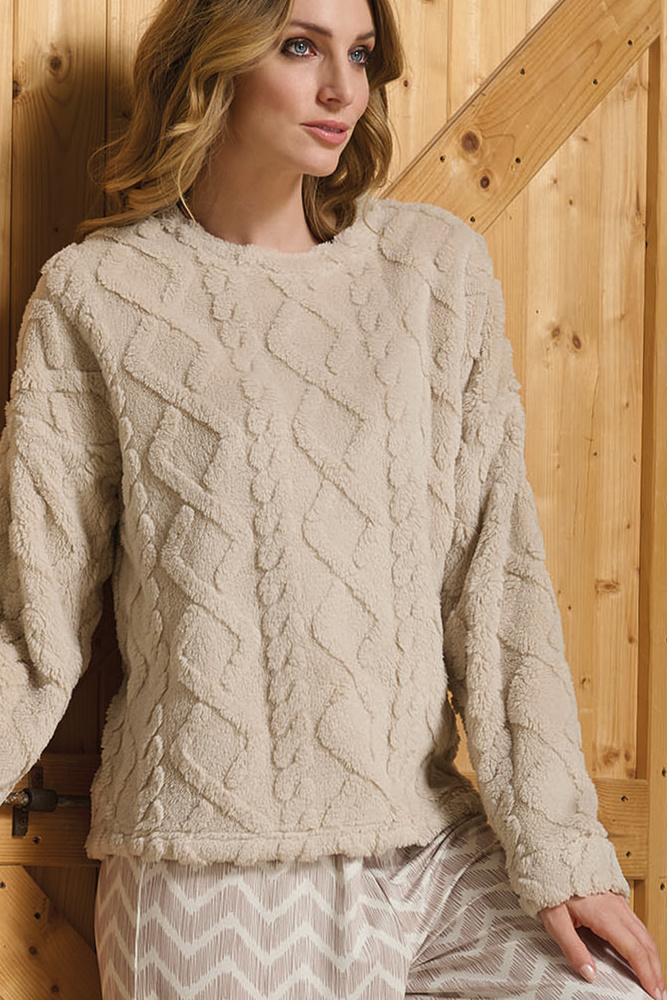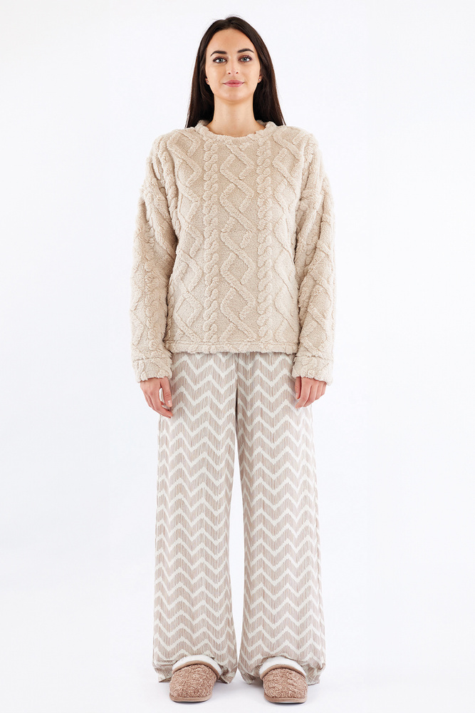 Sofie Damen-Pyjama Sorbetto Beige – warmer Sherpa, Palazzo, elegant und weich