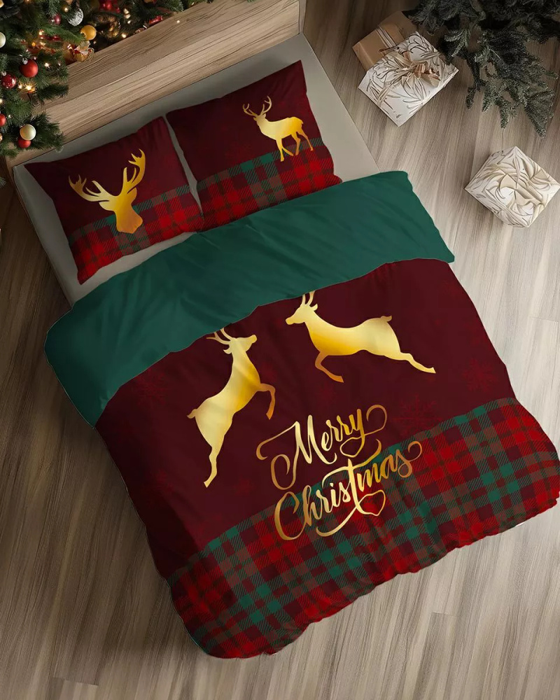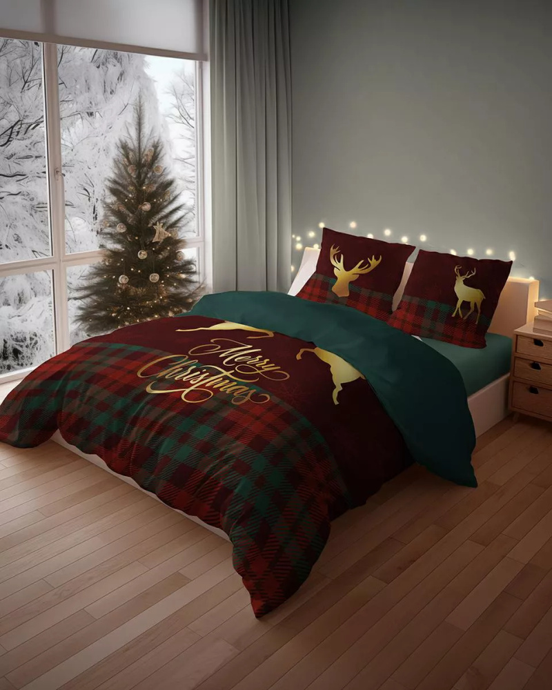 5827 A Baumwoll-Weihnachtsbettwäsche Christmas Dreams Detexpol mit Karomuster und Rentier Merry Christmas – Weihnachtsset aus 100 % Baumwolle