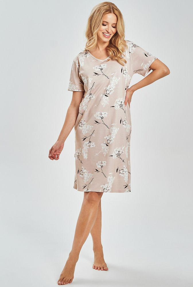 Die kurzen Ärmel sorgen für angenehme Luftzirkulation und machen das Modell perfekt als Sommer-Nachthemd für Damen. Der klassische Rundhalsausschnitt bietet Komfort und zeitlose Optik, während der zarte Pflanzenprint Frische und Natürlichkeit in die Nachtwäsche bringt.