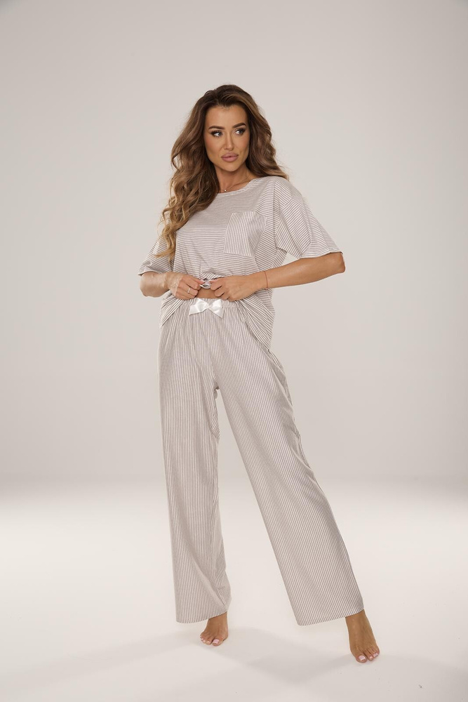 - Bequemer Damenpyjama aus reiner Baumwolle mit Streifenmuster. Lockeres Shirt mit kurzem Ärmel, Rundhalsausschnitt und lange Hose mit dekorativer Schleife – ideal zum Schlafen und Entspannen.