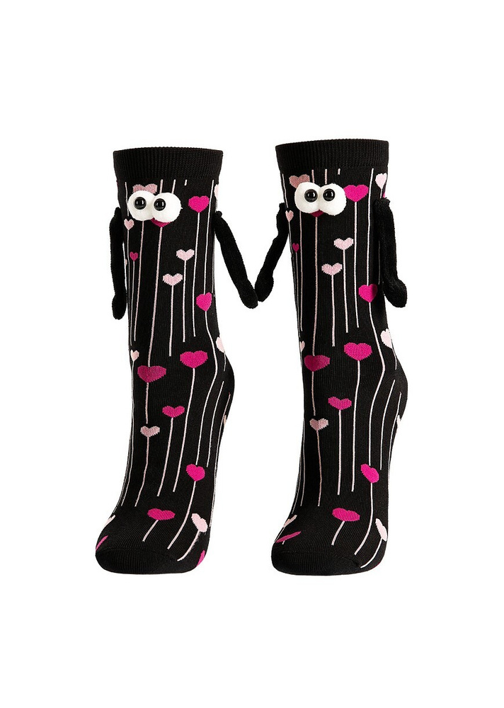 Das besondere Design mit niedlichen 3D-Augen macht die Socken einzigartig und verspielt. An den Seiten befinden sich angenähte Händchen mit Magneten, dank derer sich die Socken „an den Händen halten“ können – ein liebevolles und zugleich witziges Detail.