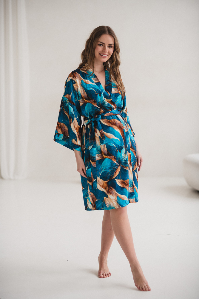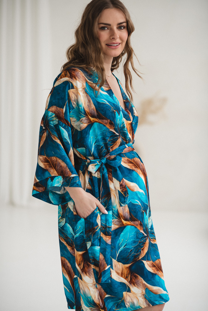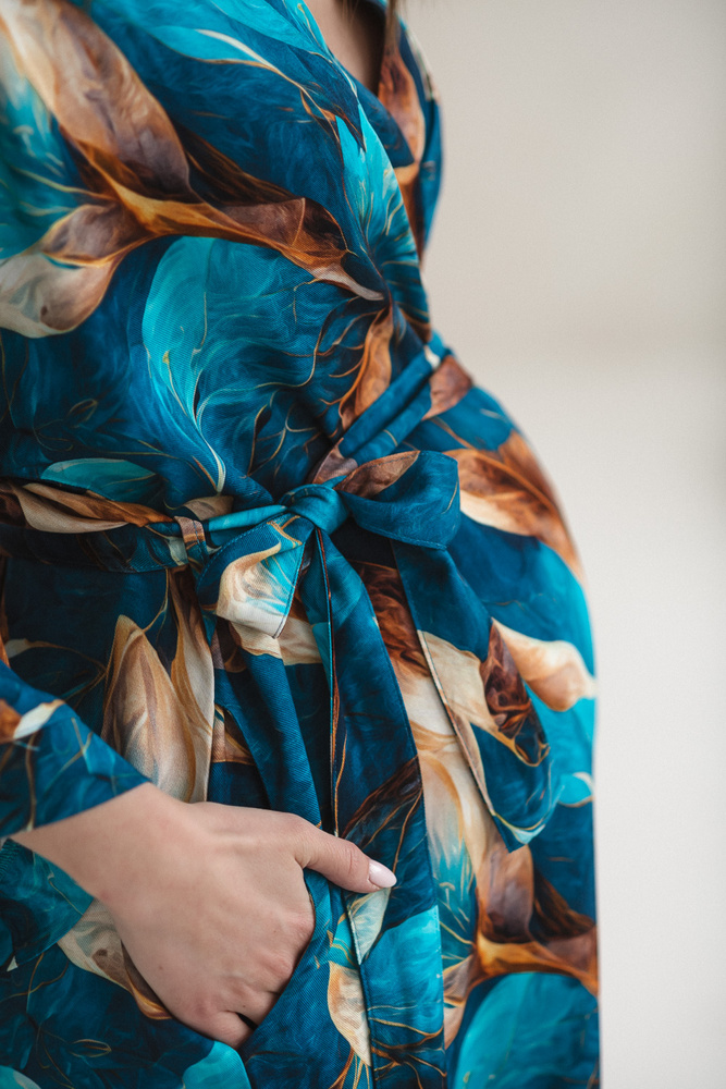 Der Kimono-Schnitt mit Bindegürtel ermöglicht eine individuelle Anpassung an den wachsenden Babybauch und bietet auch nach der Geburt ausreichend Spielraum. Die verlängerte Länge sorgt für ein sicheres Gefühl im Krankenhaus oder beim Stillen zu Hause. 7/8-Ärmel erleichtern die Pflege des Neugeborenen, ohne zu stören, während praktische Taschen Platz für kleine Alltagsgegenstände bieten.