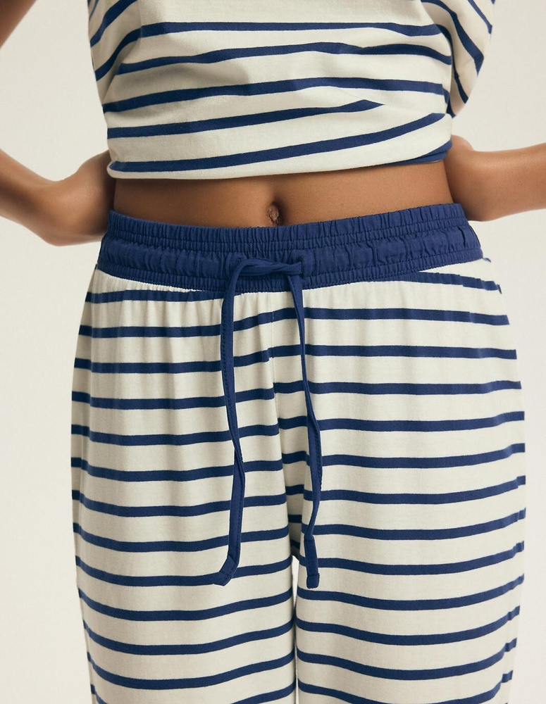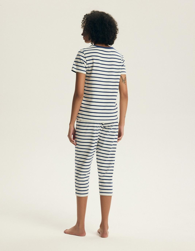- Damenpyjama aus 100% Baumwolle mit Streifenmuster – Kurzarmshirt und 7/8-Hose mit verstellbarem Bindeband. Natürlicher Komfort für erholsamen Schlaf und entspannte Stunden zu Hause.