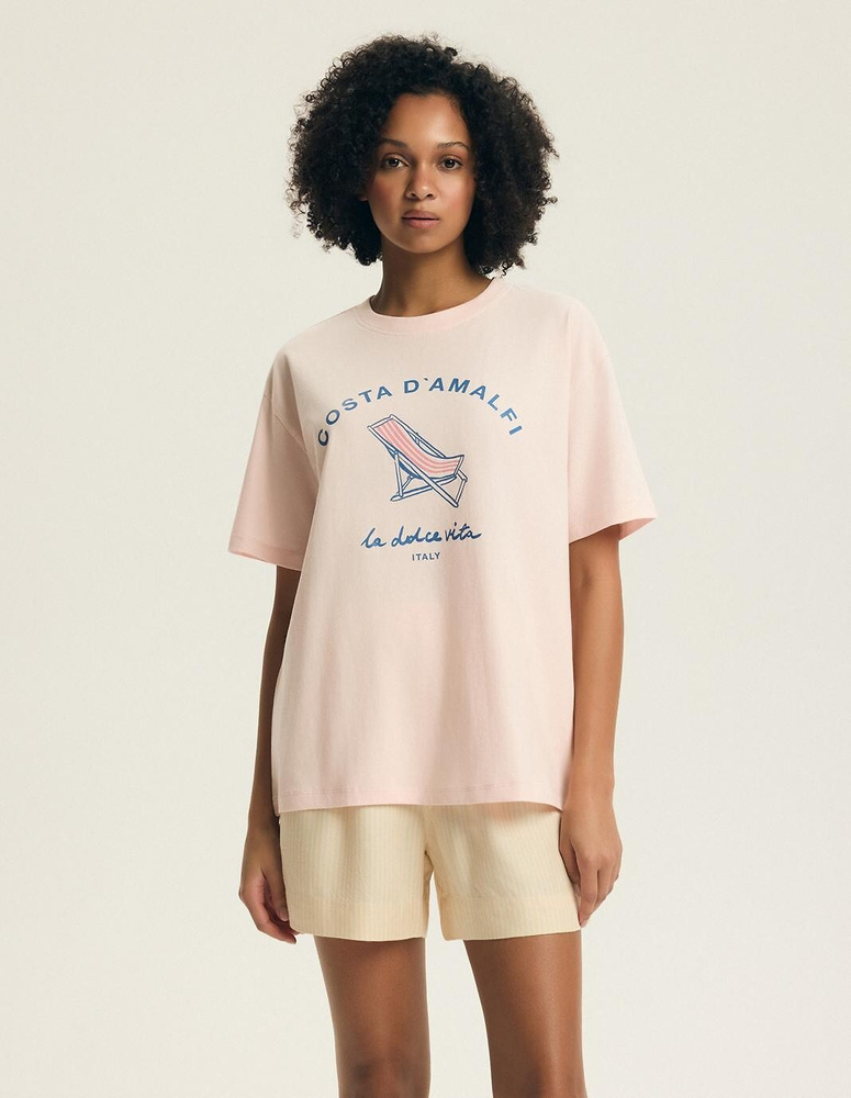 Das Kurzarmshirt besteht aus 100% Baumwolle. Das natürliche Material ist hautfreundlich und unterstützt eine gute Luftzirkulation, was besonders in warmen Nächten wichtig ist. Der runde Halsausschnitt verleiht dem Oberteil einen klassischen Look, während der farbige Strand-Print vorne für einen frischen, sommerlichen Akzent sorgt.